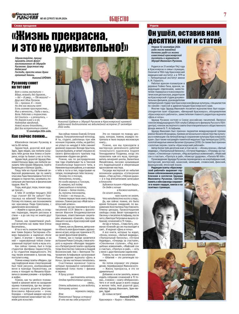 Утром 12 сентября 2024 года после тяжёлой болезни ушёл из жизни известный красноярский писатель и журналист Эдуард Иванович Русаков. Родился он 31 октября 1942 года в Красноярске в семье служащих. Окончил в 1966 году Красноярский медицинский институт, а в 1979-м - Литературный институт имени А. М. Горького. Работал врачом-психиатром в деревне Поймо-Тина, врачом, заведующим отделением, заместителем главврача в психоневрологическом диспансере, редактором на Красноярской студии документальных фильмов, руководителем литературной студии при Красноярском Дворце культуры, специалистом по связям с прессой в администрации Красноярского края. Многие годы Эдуард Иванович посвятил журналистике: был корреспондентом газет "Евразия", "Вечерний Красноярск", обозревателем "Красноярского рабочего", заместитель главного редактора журнала "День и ночь"...