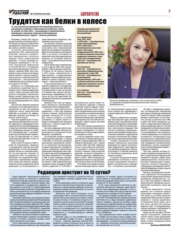 То, что Енисейское управление Роскомнадзора далеко не равнодушно к редакции "Красноярского рабочего", давно не секрет. Но одно дело - вылавливать в опубликованных материалах "признаки нарушения действующего законодательства", другое - мешать работать. Например, 6 марта 2024 года редакция получила по электронной почте письмо за подписью заместителя руководителя управления Александра Сватуся, где было сказано: "В целях проверки соблюдения требований ст. 19.1 Закона Российской Федерации "О средствах массовой информации" просим сообщить сведения (ФИО, дату рождения) о лице, которое в настоящее время является главным редактором". Буквально на следующий день в Енисейское управление был отправлен ответ. При этом мы обратили внимание чиновника, что в плане деятельности управления на 2024 год проверка редакции газеты "Красноярский рабочий" не значится. Но, видимо, действует принцип: если нельзя, но хочется, значит можно...