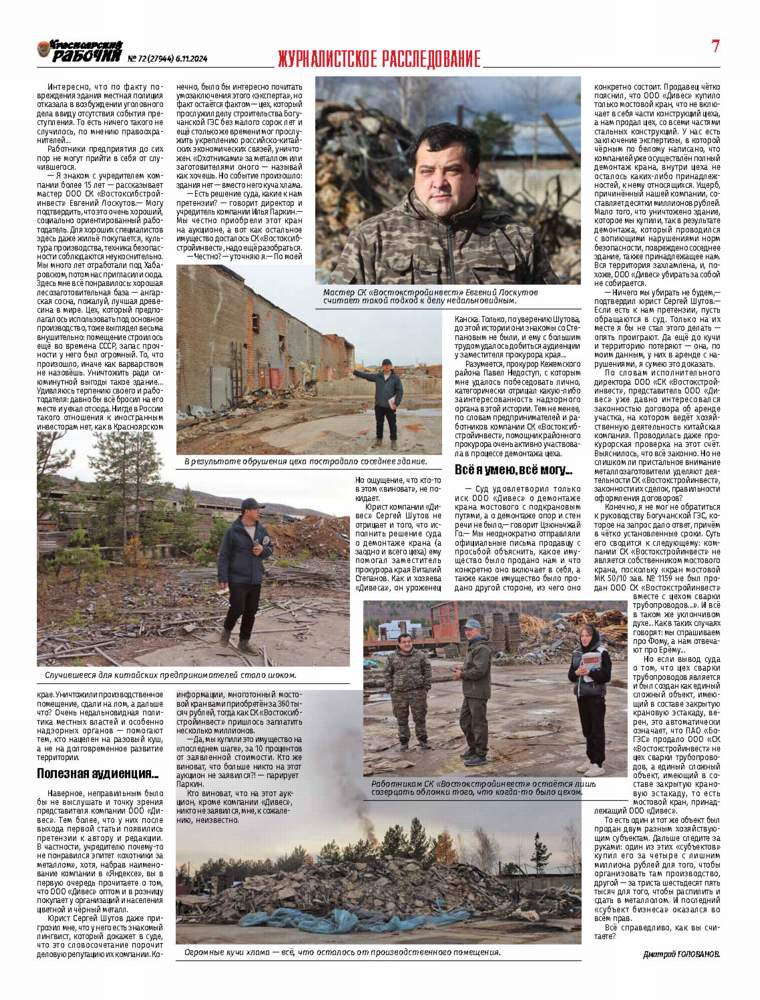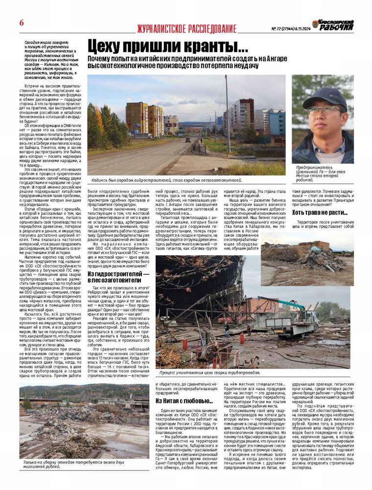"Статья "Продан кран с крышей", в которой я рассказывал о том, как китайские бизнесмены, пытаясь организовать своё производство по переработке древесины, потеряли, в результате и деньги, и имущество, получила достаточно широкий отклик, - пишет журналист Дмитрий Голованов. - Тема оказалась настолько интересной, что я решил продолжить расследование, встретившись со всеми участниками этой истории. Напомню коротко ход событий. Частное предприятие под названием ООО "СК "Востокстройинвест" приобрело у Богучанской ГЭС имущество - помещение цеха сварки трубопроводов - с целью разместить там производство по глубокой переработке древесины. В то же время ООО "Дивес" - компания, специализирующаяся на сборе вторичного лома чёрных металлов, приобрела находящийся в помещении этого цеха мостовой кран. Казалось бы, всё достаточно просто - одна компания забирает купленное ею имущество, другая не мешает ей в этом, и все расходятся миром. Но так не получилось".
