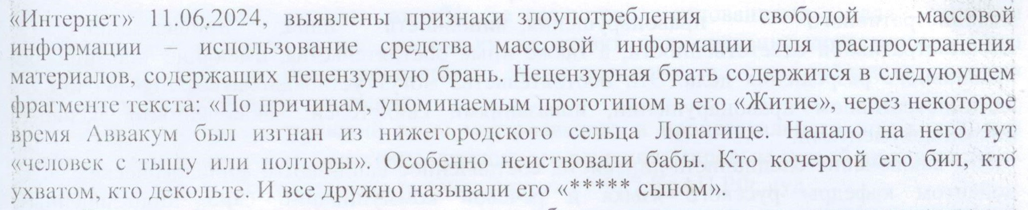 К вопросу о брани -- чуть позже. А пока -- о памятнике русской словесности. Судья, назвавшая протопопа Аввакума -- известнейшего писателя, проповедника и ревнителя православия, священномученика -- прототипом, вообще, судя по всему, о таковом не слышала и перед судебным заседанием даже не пыталась прочитать великое произведение. В качестве доказательства приведу более полную, можно даже сказать -- добуквенную, цитату из решений, вынесенных Еленой Бартко: