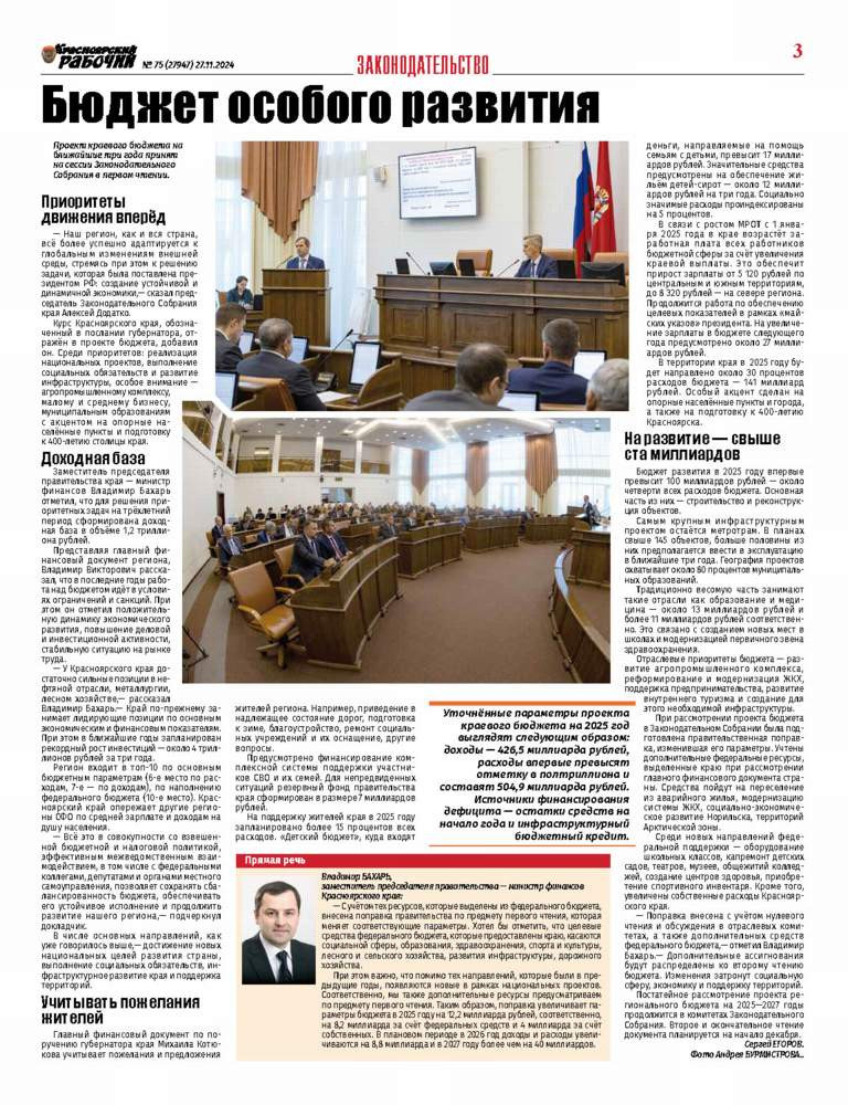 Проект краевого бюджета на ближайшие три года принят на сессии Законодательного Собрания в первом чтении. «Наш регион, как и вся страна, всё более успешно адаптируется к глобальным изменениям внешней среды, стремясь при этом к решению задачи, которая была поставлена президентом РФ: создание устойчивой и динамичной экономики»,- сказал председатель Законодательного Собрания края Алексей Додатко. Курс Красноярского края, обозначенный в послании губернатора, отражён в проекте бюджета, добавил он. Среди приоритетов: реализация национальных проектов, выполнение социальных обязательств и развитие инфраструктуры, особое внимание - агропромышленному комплексу, малому и среднему бизнесу, муниципальным образованиям с акцентом на опорные населённые пункты и подготовку к 400-летию столицы края.