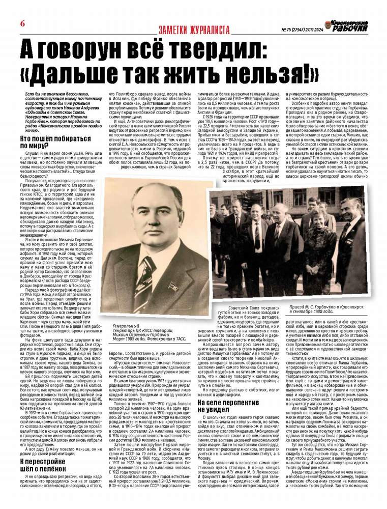 «Если бы не окаянная бессонница, соответствующая моему почтенному возрасту, я так бы и не услышал аудиоверсию книги Николая Андреева "Однажды в Советском Союзе, - пишет журналист Теодор Шевченко. - Невероятная история Михаила Горбачёва", которая передавалась по радио "Комсомольская правда" поздно ночью. Слушал и не верил своим ушам. Речь шла о детстве - самом радостном периоде жизни человека, но постоянно звучали зловещие слова "невероятная бедность", "нечеловеческая жестокость властей"... Откуда такая безысходность? Получалось, что диктор вещал не о селе Привольном благодатного Ставропольского края, где родился и рос будущий генсек КПСС, а о территории едва ли не за колючей проволокой, где находились измождённые, босые и дети, и взрослые...»