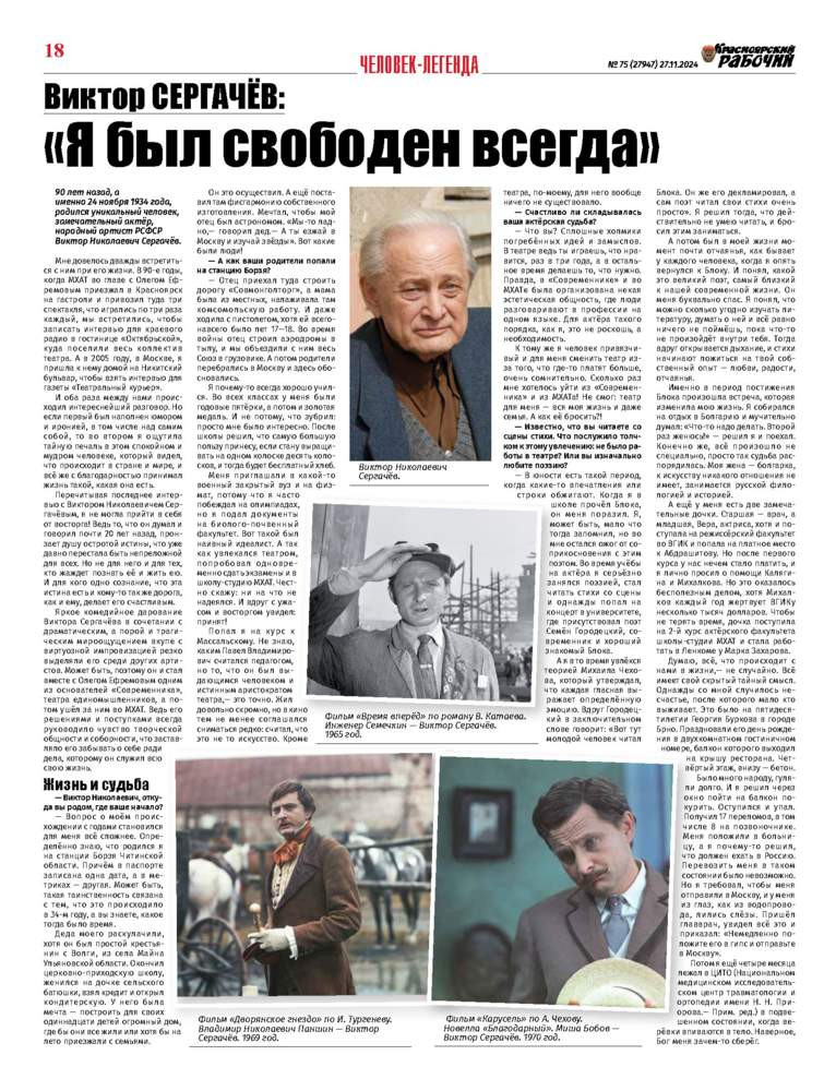 90 лет назад, а именно 24 ноября 1934 года, родился уникальный человек, замечательный актёр, народный артист РСФСР Виктор Николаевич Сергачёв. «Мне довелось дважды встретиться с ним при его жизни, - пишет журналист Наталья Савватеева. - В 90-е годы, когда МХАТ во главе с Олегом Ефремовым приезжал в Красноярск на гастроли и привозил туда три спектакля, что игрались по три раза каждый, мы встретились, чтобы записать интервью для краевого радио в гостинице "Октябрьской", куда поселили весь коллектив театра. А в 2005 году, в Москве, я пришла к нему домой на Никитский бульвар, чтобы взять интервью для газеты "Театральный курьер". И оба раза между нами происходил интереснейший разговор. Но если первый был наполнен юмором и иронией, в том числе над самим собой, то во втором я ощутила тайную печаль в этом спокойном и мудром человеке».