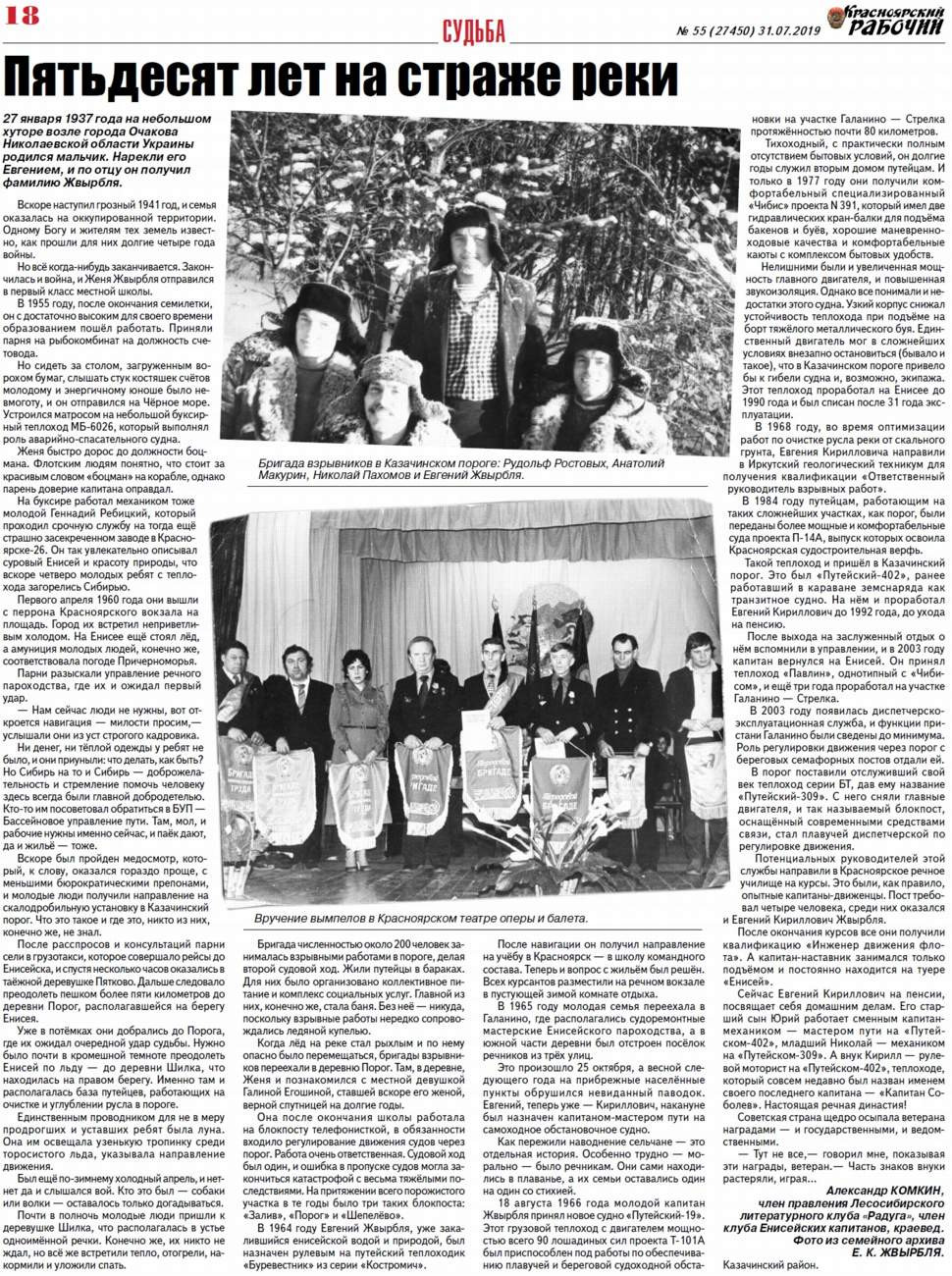 Сейчас Евгений Кириллович Жвырбля на пенсии, посвящает себя домашним делам. Его старший сын Юрий работает сменным капитан-механиком - мастером пути на "Путейском-402", младший Николай - механиком на "Путейском-309". А внук Кирилл - рулевой моторист на "Путейском-402", теплоходе, который совсем недавно был назван именем своего последнего капитана - "Капитан Соболев". Настоящая речная династия, посвятившая себя Казачинскому порогу на Енисее!