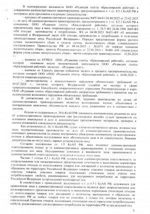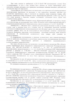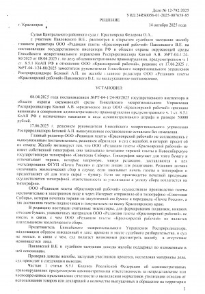 Судебное решение вынесено. Будет ли Енисейское управление Росприроднадзора упорствовать и обжаловать его, сказать пока трудно. Но ведь и наказывать скоро будет некого - ООО "Редакция газеты "Красноярский рабочий" с начала 2025 года не выпускает газету, его банковский счёт пуст и вскоре будет совсем закрыт, как и само юрлицо.