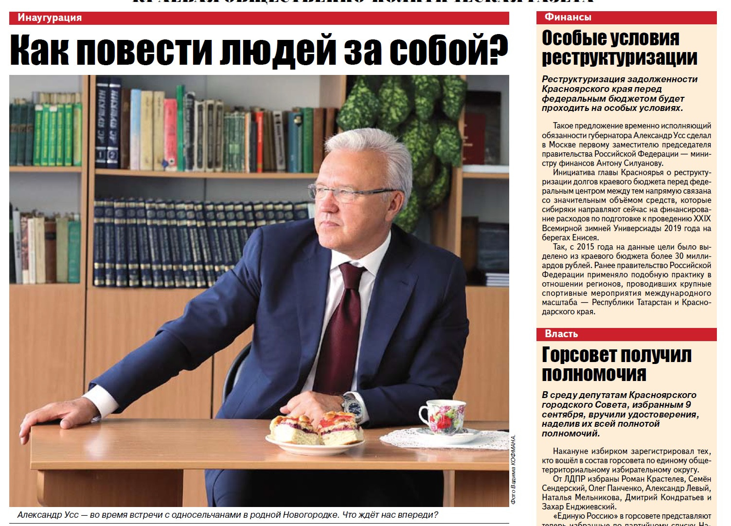 В пятницу, 21 сентября, в Большом концертном зале Красноярской фиармонии состоится инаугурация Александра Усса, победившего на выборах 9 сентября. Какие напутствия дают ему читатели и журналисты «Красноярского рабочего»?