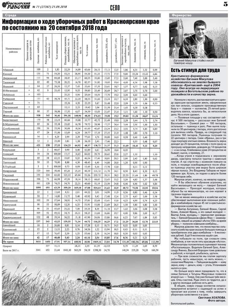 Крестьянско-фермерское хозяйство Евгения Макулова обосновалось на землях бывшего совхоза «Критовский» ещё в 2004 году. Сейчас оно всегда на лидирующих позициях в Боготольском районе. А начинали с малого, распахивая взятые в аренду заросшие кустарником земли, оформленные как паи сельчан, создавали производственную базу и – главное – коллектив. 25-летний руководитель взялся, казалось бы, за непосильное дело. Но в итоге сдюжил.
