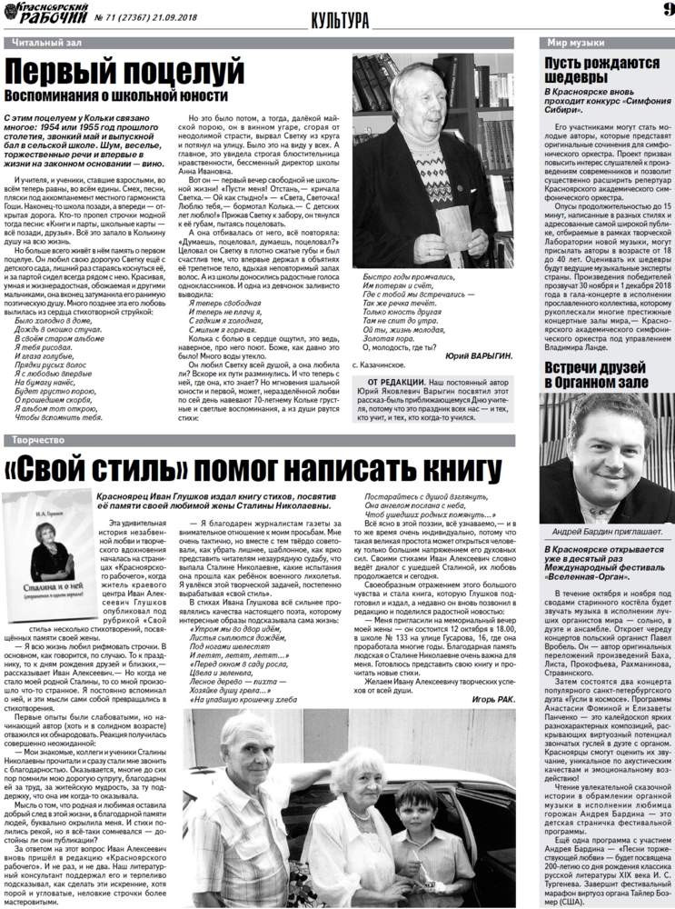 Красноярец Иван Глушков издал книгу стихов, посвятив её памяти своей любимой жены Сталины Николаевны. Это удивительная история незабвенной любви и творческого вдохновения началась на страницах «КР», когда Иван Алексеевич опубликовал под рубрикой «Свой стиль» несколько стихотворений, посвящённых памяти своей жены.