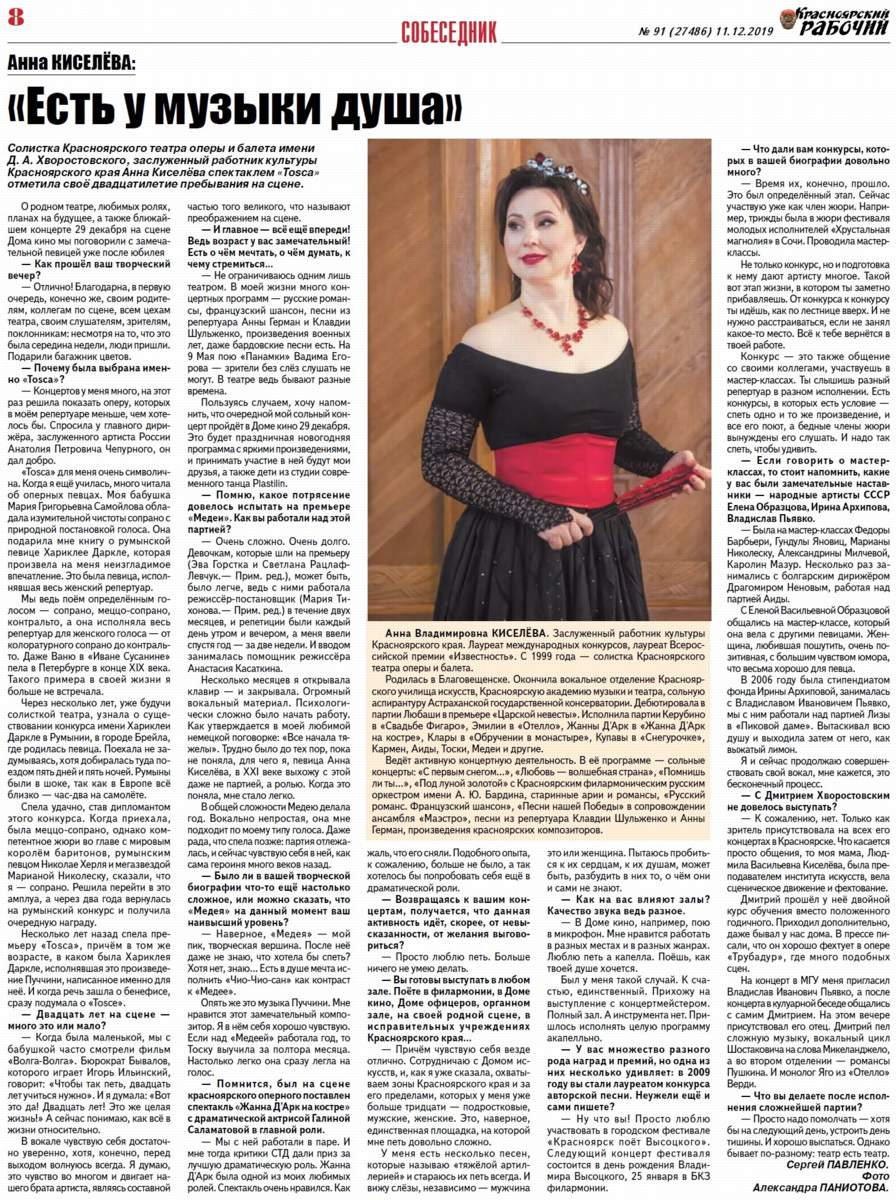 Солистка Красноярского театра оперы и балета имени Д. А. Хворостовского, заслуженный работник культуры Красноярского края Анна Киселёва спектаклем "Tosca" отметила своё двадцатилетие пребывания на сцене. О родном театре, любимых ролях, планах на будущее, а также ближайшем концерте 29 декабря на сцене Дома кино обозреватель "КР" Сергей Павленко поговорил с певицей уже после юбилея.