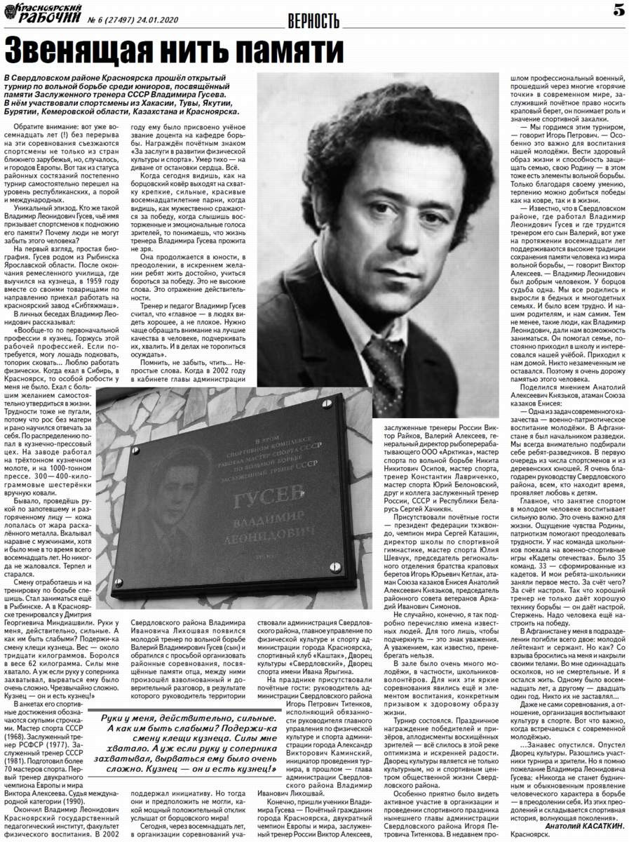 В Свердловском районе Красноярска прошёл открытый турнир по вольной борьбе среди юниоров, посвящённый памяти Заслуженного тренера СССР Владимира Гусева. В нём участвовали спортсмены из Хакасии, Тувы, Якутии, Бурятии, Кемеровской области, Казахстана и Красноярска. Обратите внимание: вот уже восемнадцать лет (!) без перерыва на эти соревнования съезжаются спортсмены не только из стран ближнего зарубежья, но, случалось, и городов Европы.