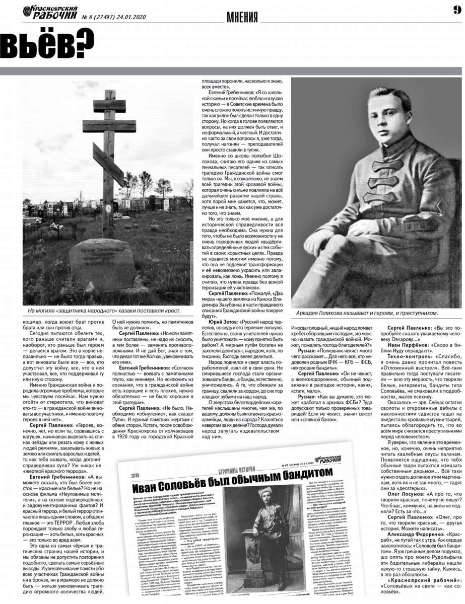Прочитал в "Красноярском рабочем" за 13 ноября 2019 года интервью Сергея Павленко с краеведом Валентином Овчаровым "Иван Соловьёв был обычным бандитом", и у меня возник ряд вопросов, - пишет житель Академгородка Сергей Орловский". - О Соловьёве писали Солоухин и Чмыхало, снимался фильм, но "писатель имеет право на вымысел", а архивы не всегда содержат полную информацию. Солоухина и Чмыхало уже нет в живых, так что возразить Овчарову некому". Читайте в номере не только это письмо, но и многочисленные отклики с нашего канала на "Яндекс.Дзен".