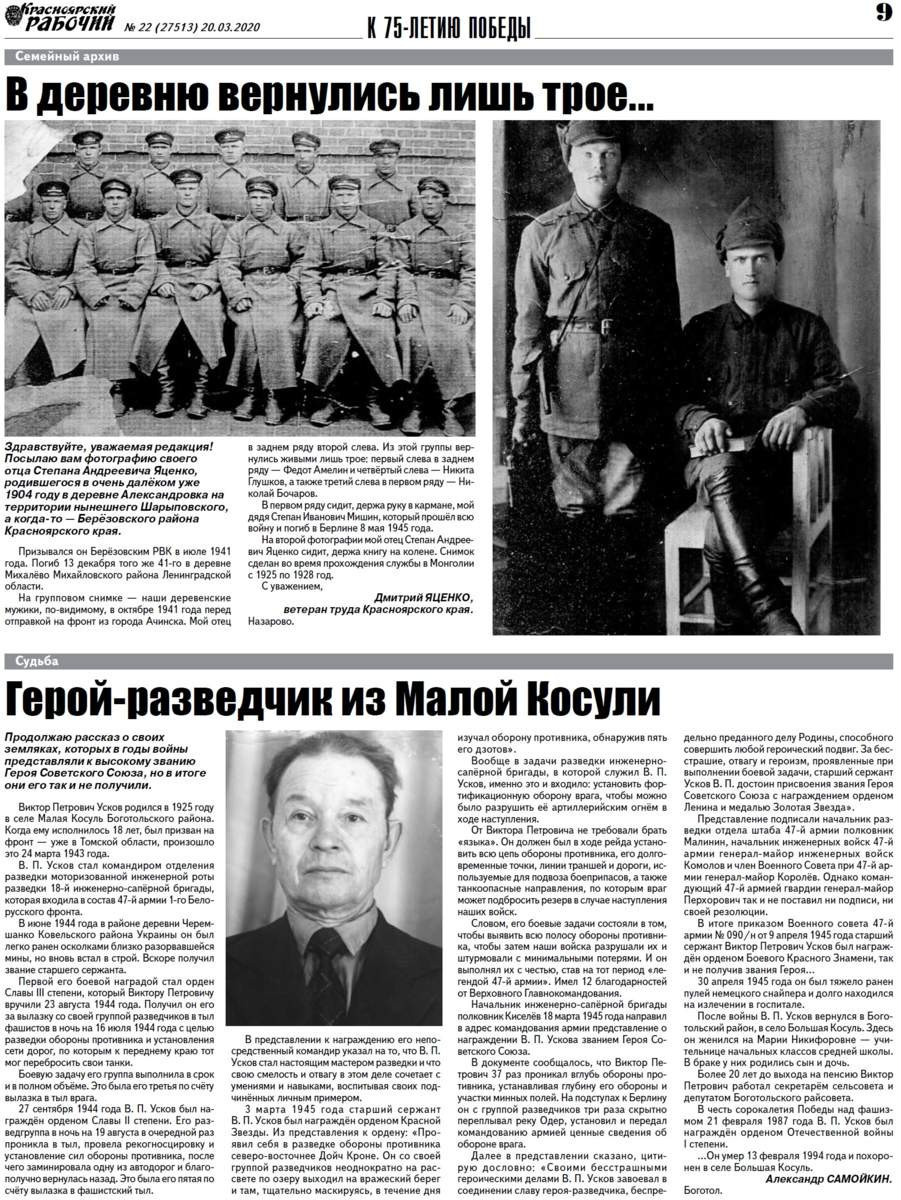 Боготольский поисковик Александр Саймойкин продолжает рассказ о своих земляках, которых в годы войны представляли к высокому званию Героя Советского Союза, но в итоге они его так и не получили. Один из них - Виктор Петрович Усков, который родился в 1925 году в селе Малая Косуль. Когда ему исполнилось 18 лет, был призван на фронт и вскоре стал командиром отделения разведки. Был настоящим героем, легендой полка, был представлен с самому высокому званию, но...