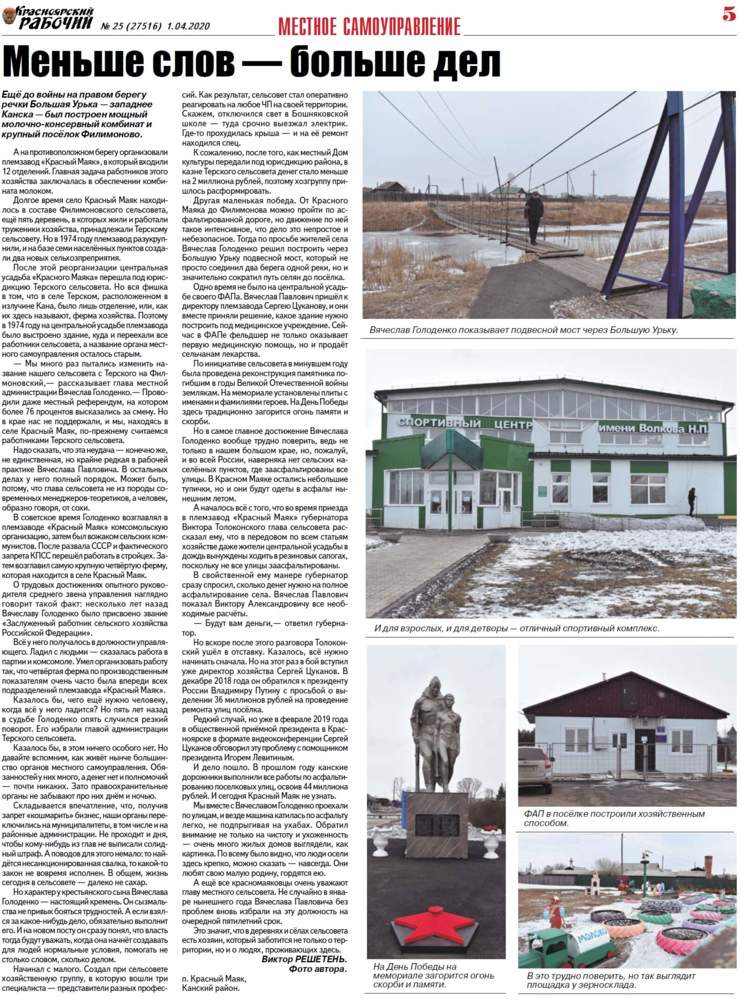 Глава Терского сельсовета Канского района Вячеслав Голоденко не из породы менеджеров-теоретиков, а человек, образно говоря, от сохи. В советское время возглавлял в племзаводе "Красный Маяк" комсомольскую организацию, затем был вожаком сельских коммунистов. После развала СССР перешёл работать в стройцех. Затем возглавил самую крупную четвёртую ферму, которая находится в селе Красный Маяк. Несколько лет назад ему было присвоено звание "Заслуженный работник сельского хозяйства Российской Федерации".
