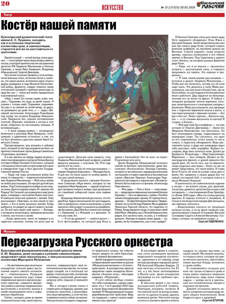 Красноярский драматический театр имени А. С. Пушкина, находясь, как и остальные творческие коллективы края, в самоизоляции, старается всё же не расставаться со зрителями. Одной из акций стала прямая трансляция вечера памяти у костра, в которой приняли участие заслуженные артистки РФ Людмила Михненкова и Наталья Горячева, а также Иван Кривушин, Владимир Абакановский, Георгий Дмитриев.