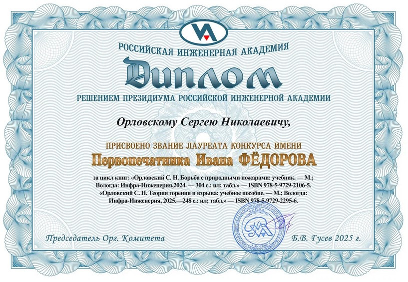 Звание «Лауреат конкурса имени первопечатника Ивана Фёдорова» ему присвоено за две книги: учебник "Борьба с природными пожарами" и учебное пособие "Теория горения и взрыва", выпущенные в Вологде в 2024 и 2025 годах издательством "Инфра-Инженерия".
