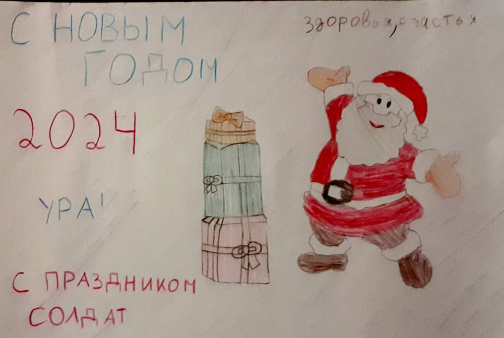 Ребята не только рисовали, но и писали на обратной стороне открыток обращения к воинам в стихах и прозе. В текстовой части эксклюзивных посланий юные красноярцы поздравили участников спецоперации с Новым годом, пожелали им счастья, здоровья и удачи. Многие выражали благодарность бойцам за их работу.