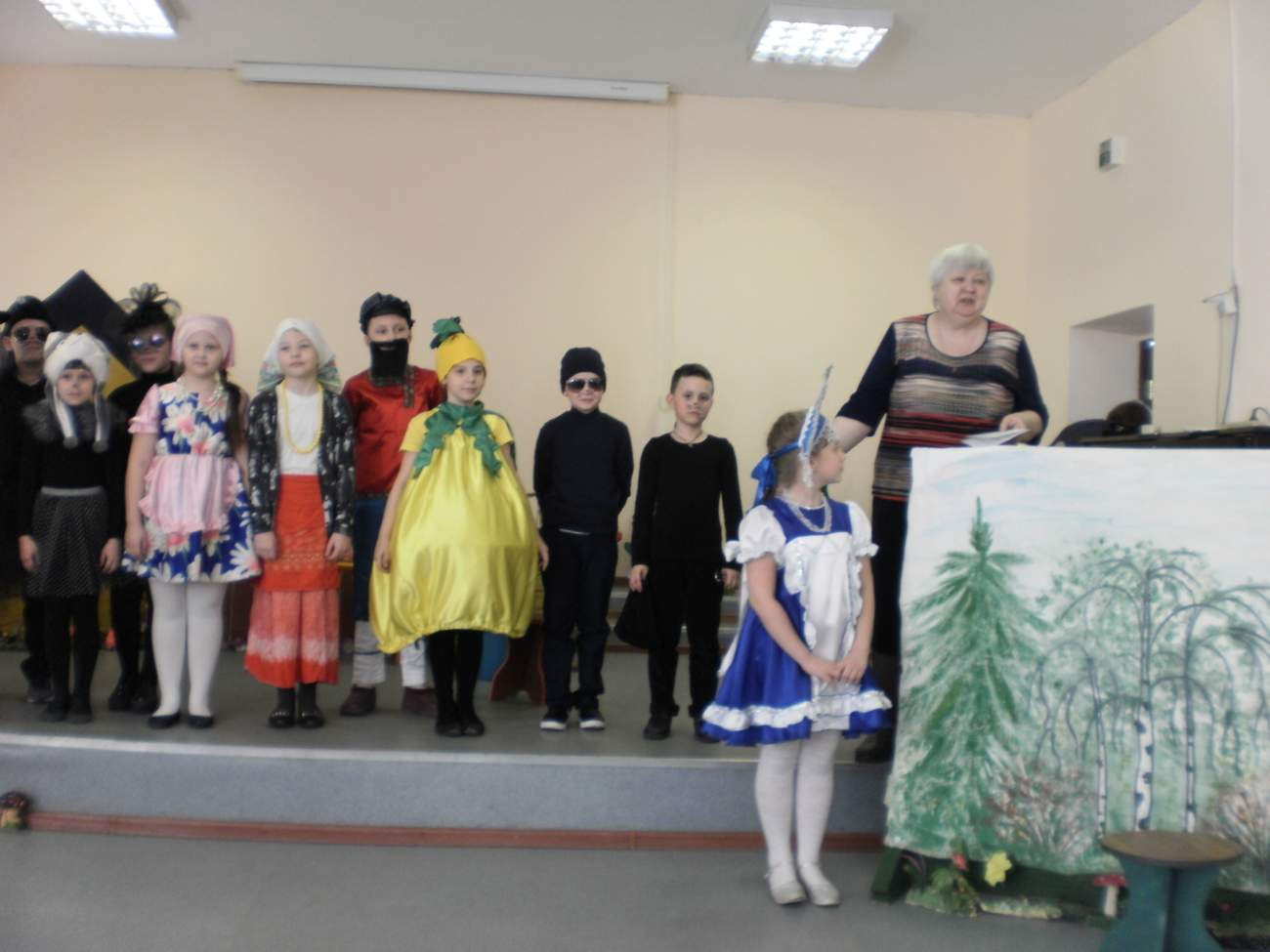 На сцену вышла более половины 2-а класса. Не удержусь, перечислю имена талантливых исполнителей: Репка - Ксения Волчёк, Дед - Егор Лысенко, Бабк - Карина Каржаева, Внучка - Лида Ростова, Жучка - Вероника Некрашевич, Кошка - Настя Купилова, Мышка - Ольга Неводольская, Дождик - Гриша Донских, трое Кротов - Лев Жданов, Глеб Акантьев и Артём Бэдэру, Жаба - Люба Кутенкова, Лягушка - Маша Чиханчина, ведущая - Дарья Постникова.