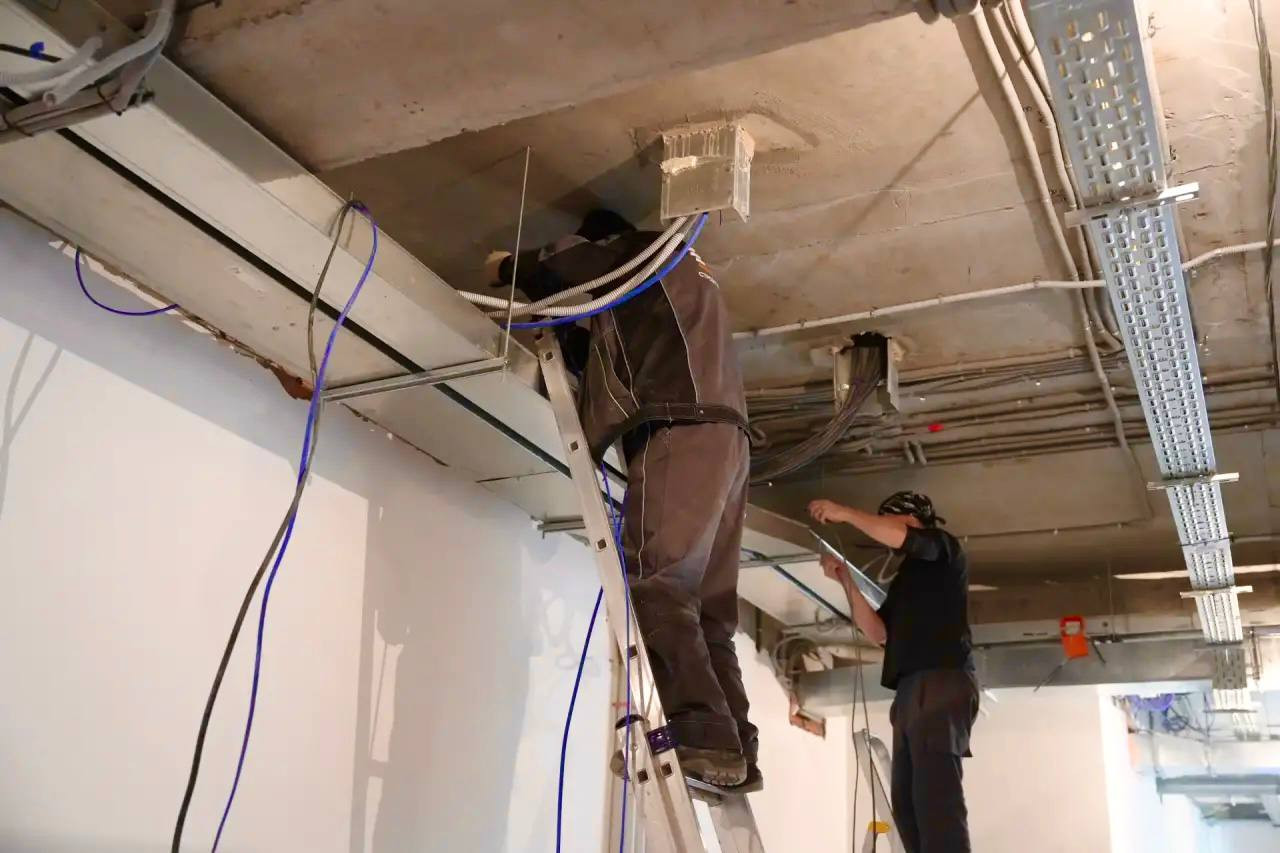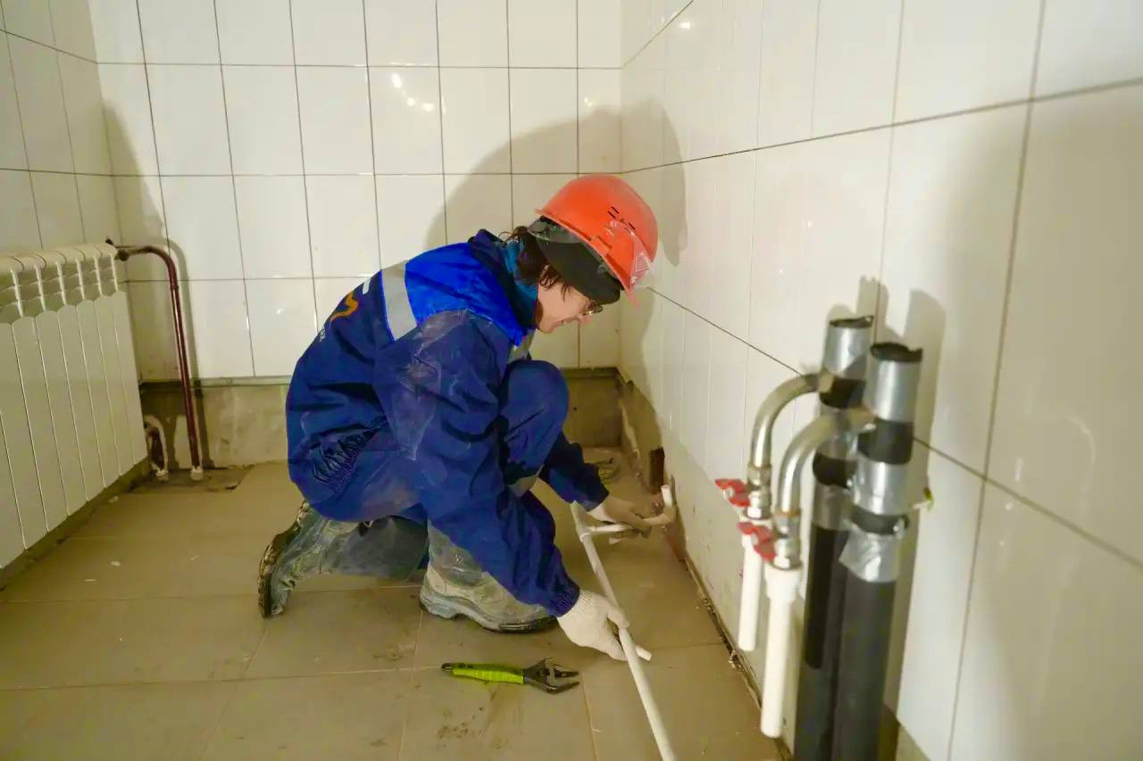 В блоках А, Б и В школы - административном, для младших и старших классов - строители красят стены и потолки на первый слой белоснежной краской, на пол укладывают линолеум. В отдельных кабинетах идёт монтаж светильников. В спортивном блоке Г, где будет размещаться 5 залов, штукатурят стены и прокладывают инженерные сети. Отопление в стадии подключения.