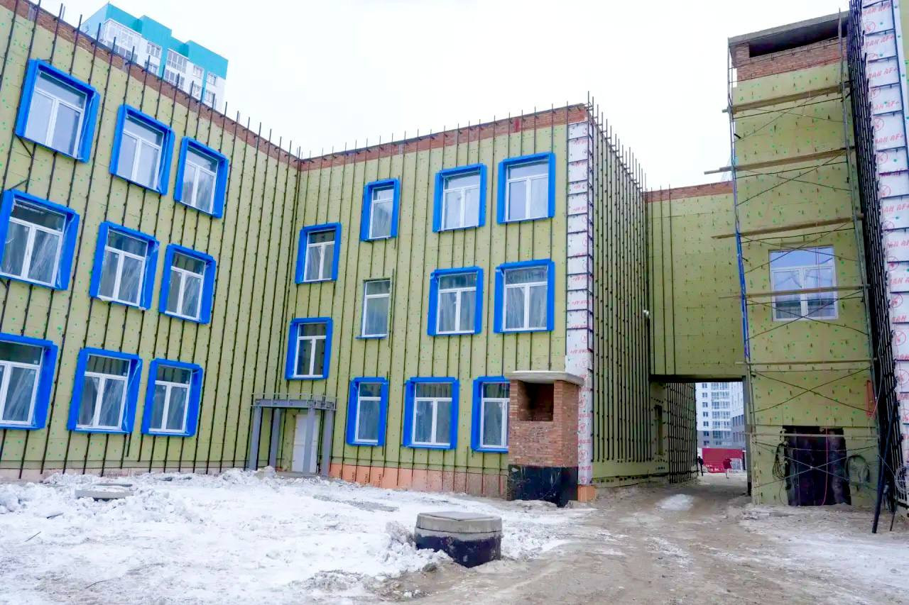 Снаружи здание уже утеплено, скоро школа начнёт приобретать красивый вид - начнётся монтаж навесных фасадов.