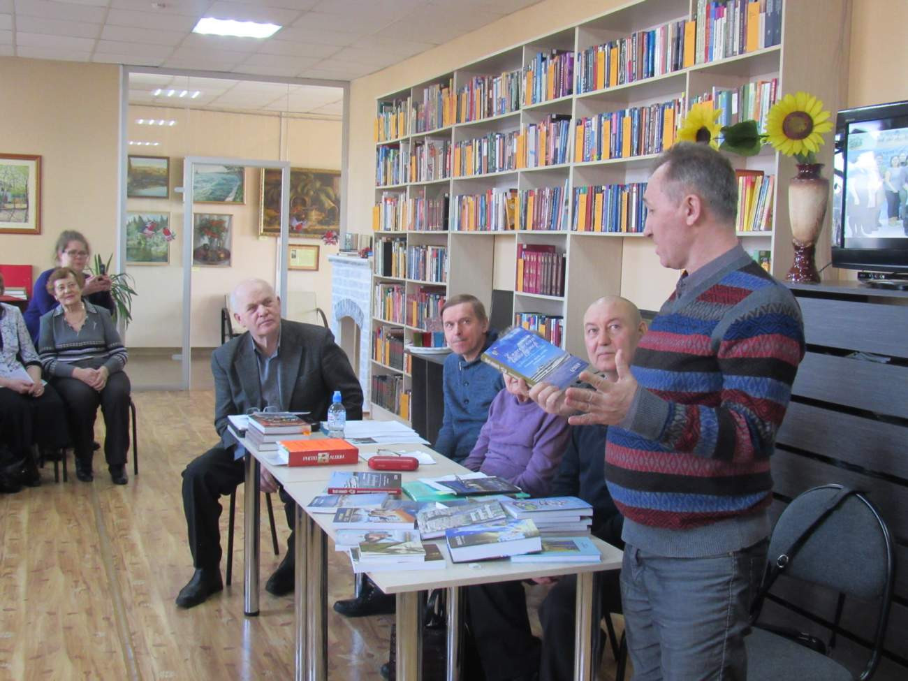 Внимательный посетитель обязательно обратит внимание на одно из украшений зала - большой букет ярких подсолнухов. Его принесла и "прописала" в библиотеке председатель литературной гостиной "Земное солнышко" при районном совете ветеранов Людмила Скурихина.