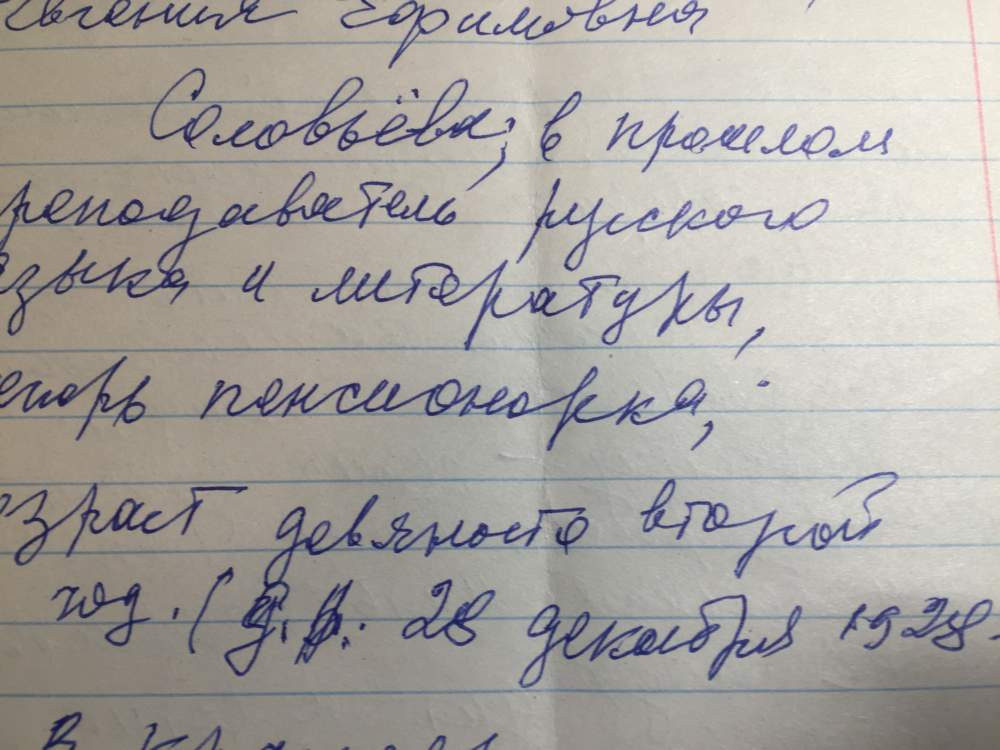Беспокоит вас Евгения Ефимовна Соловьёва, в прошлом преподаватель русского языка и литературы, теперь пенсионерка, возраст - девяносто второй год.