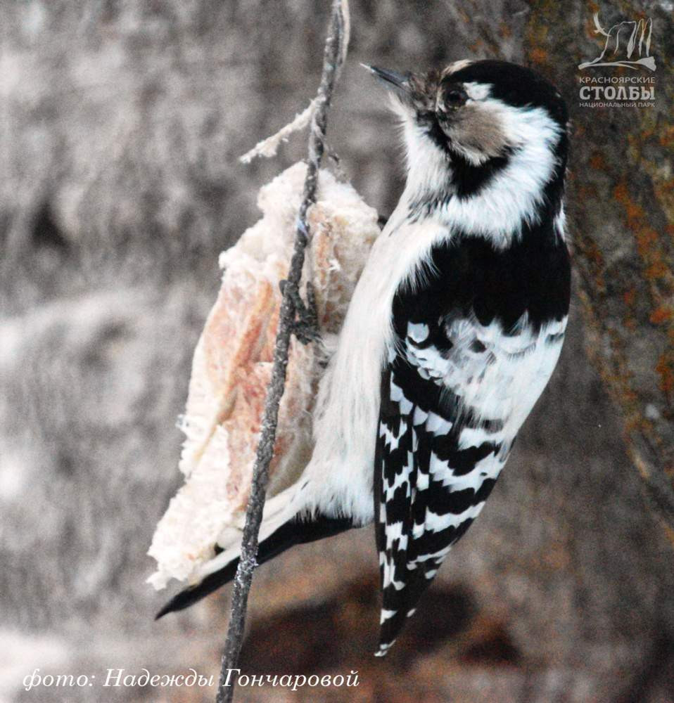 Ну, а в прошлые выходные на Восточном входе туристы нацпарка могли наблюдать самочку малого пёстрого дятла, отступившую от своей диеты. На кормушке, подвешенной на экотропе в долине ручья Моховой, она не смогла пройти (то есть пролететь!) мимо вкусного кусочка сала, и с удовольствием отклёвывала микрокусочки. Кажется, даже облизываясь от удовольствия.