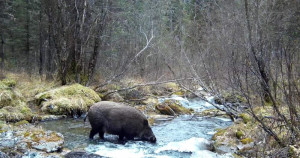 Следующим появляется упитанный самец кабана. Этот матёрый зверь, пересекая ручей, совершает характерные движения челюстями, что выдаёт процесс поглощения воды.