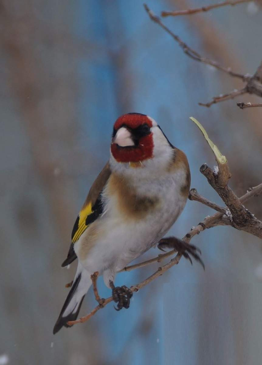 У меня такой щегол прикормился семечками в кормушке на окне кухни. И ест, и даже ночевать там пытается, сунув голову под крыло. Завтра сфотографирую, покажу.