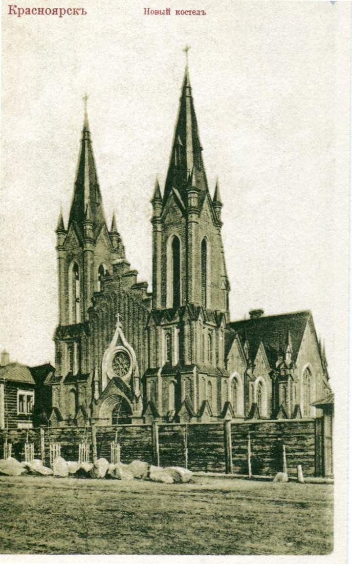 Костёл был разрушен в 1929-1930-х годах. Разрушен при жизни его создателя - замечательного красноярского архитектора Владимира Соколовского (он умер в 1959 году). Представляю, каково было ему - католику (очевидно) и автору - видеть совершаемый на его глазах вандализм. Были обрушены обе башни-звонницы, с вершины щипца скинута фигура Христа, орган с хоров выброшен на улицу.