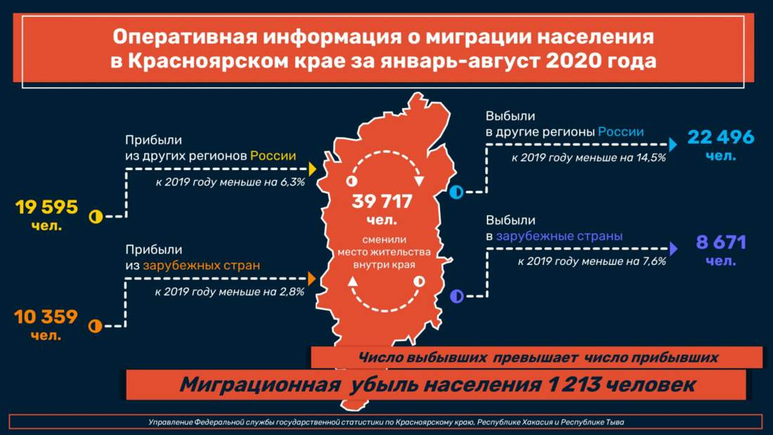 За январь - август 2020 года из Красноярского края выбыло населения больше, чем прибыло. В связи с этим сложилась миграционная убыль, которая составила 1 213 человек.