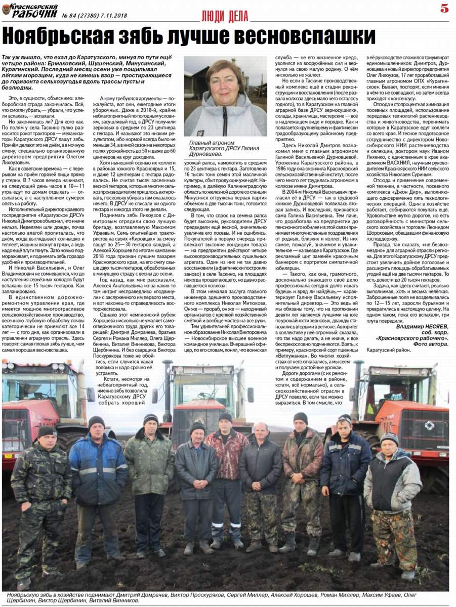 Хлеборобская страда закончилась. Всё, что смогли убрать, - убрали, что успели вспахать - вспахали. Но закончилась ли? Для кого как. По полям у села Таскино гулко разносится рокот тракторов - механизаторы Каратузского ДРСУ пашут зябь. Причём делают это не днём, а в ночную смену, специально организованную директором предприятия Олегом Лихоузовым.