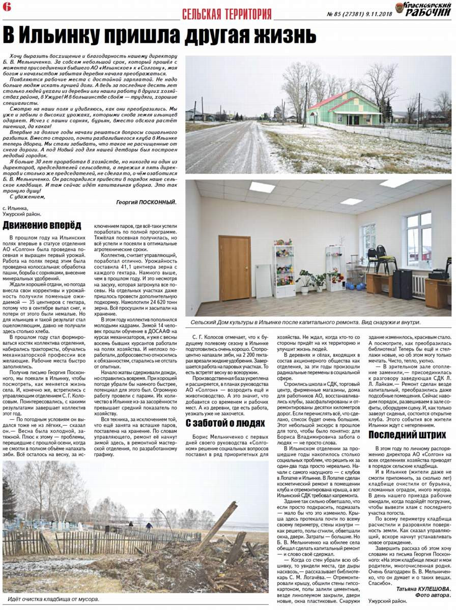 Журналистка ужурской районной газеты "Сибирский хлебороб" Татьяна Кулешова съездила в Ильинку, чтобы посмотреть, как меняется жизнь села после того, как оно перешло под крыло известного в России АО "Искра". Она поговорила с управляющим, культработниками, простыми жителями и...
