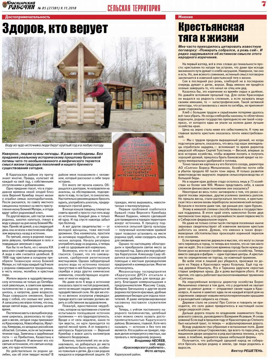 В Каратузском районе близ села Верхний Кужебар бьёт ключ, который с начала XIX века слывёт в народе священным. А вода в нём считается целебной. Весть о нём разнеслась по городам и весям, и сегодня сюда приезжают даже зарубежные гости - из Прибалтики, Казахстана, Израиля. И величают его кто святым источником, кто святым колодцем, кто чудо-источником.