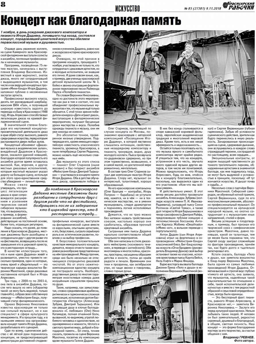 1 ноября, в день рождения джазового композитора и пианиста Игоря Дадаяна, почившего год назад, состоялся концерт, порадовавший ценителей искусства обилием первоклассной музыки и душевностью. Отдавая дань уважения коллеге, на сцене Камерного зала Красноярской филармонии выступали солисты и ансамбли, почтенные профессионалы и начинающие музыканты.