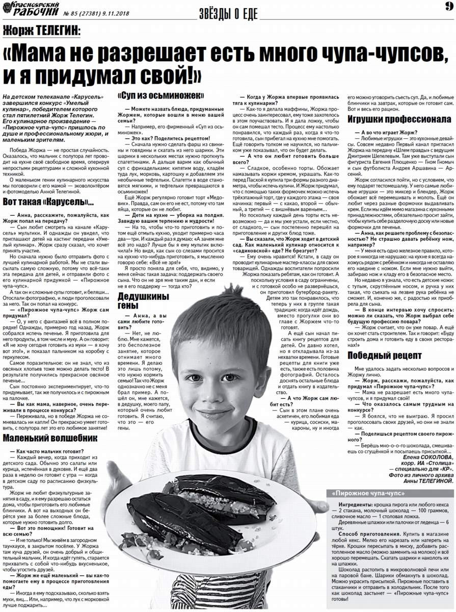 На детском телеканале "Карусель" завершился конкурс "Умелый кулинар", победителем которого стал пятилетний Жорж Телегин. Мальчик с полутора лет проводит на кухне своё свободное время, оперируя непростыми рецептурами и сложной кухонной техникой. О маленьком гении кулинарного искусства мы поговорили с его мамой Анной Телегиной.