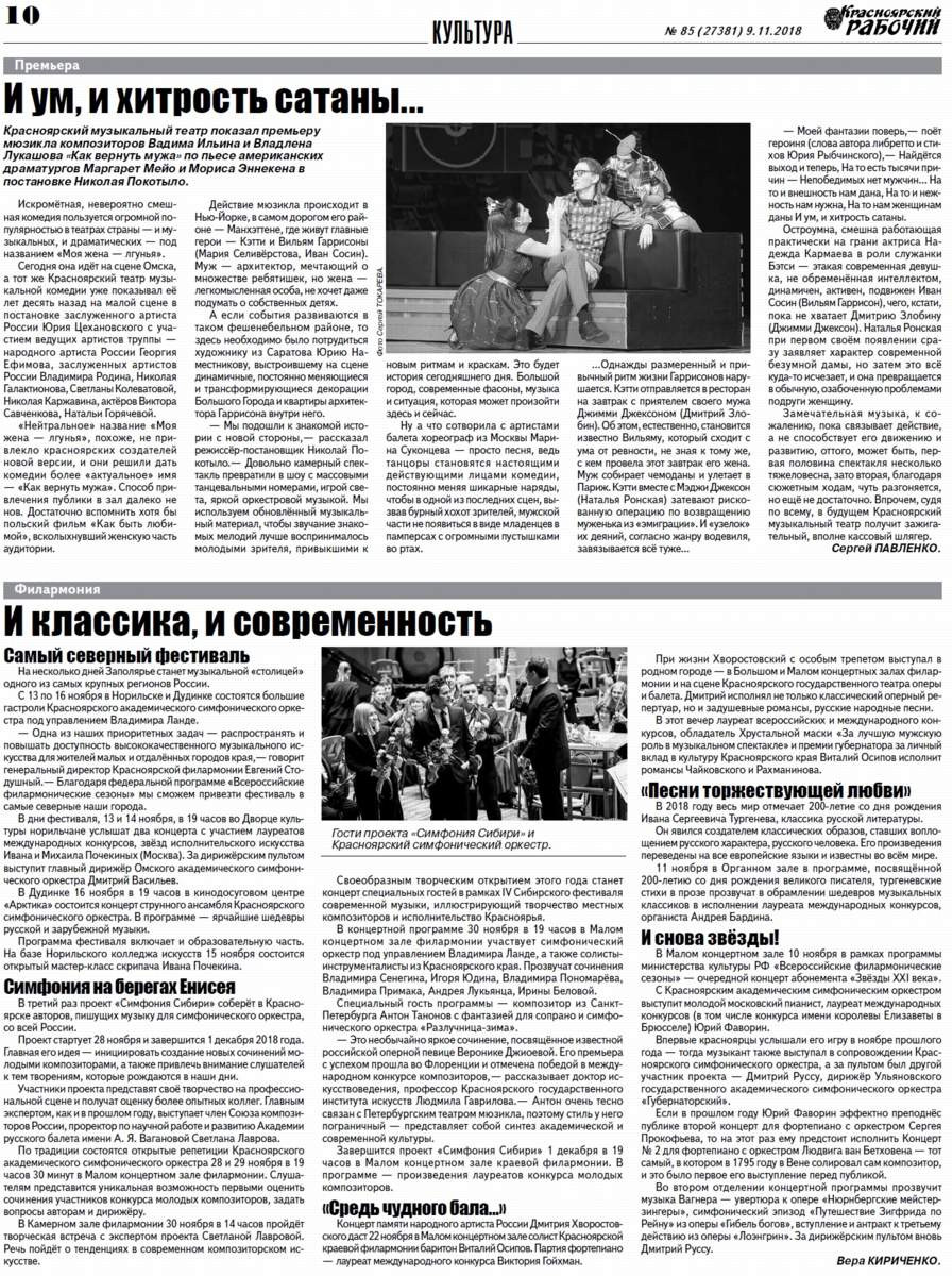 Красноярский музыкальный театр показал премьеру мюзикла композиторов Вадима Ильина и Владлена Лукашова "Как вернуть мужа" по пьесе американских драматургов Маргарет Мейо и Мориса Эннекена в постановке Николая Покотыло. Искромётная, невероятно смешная комедия пользуется огромной популярностью в театрах страны - и музыкальных, и драматических - под названием "Моя жена - лгунья".