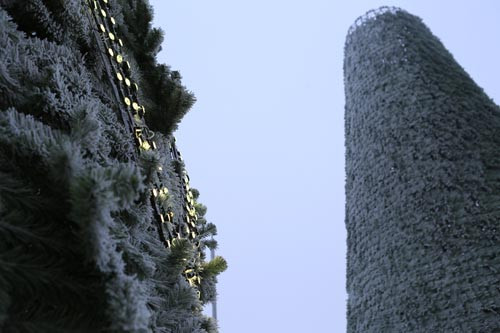 Здесь завершается монтаж главной городской 55-метровой ёлки. Верхушка пока отделена от основания, зато на ней уже заиграла иллюминация. Всего же на новогоднем символе около 60 тысяч диодов.