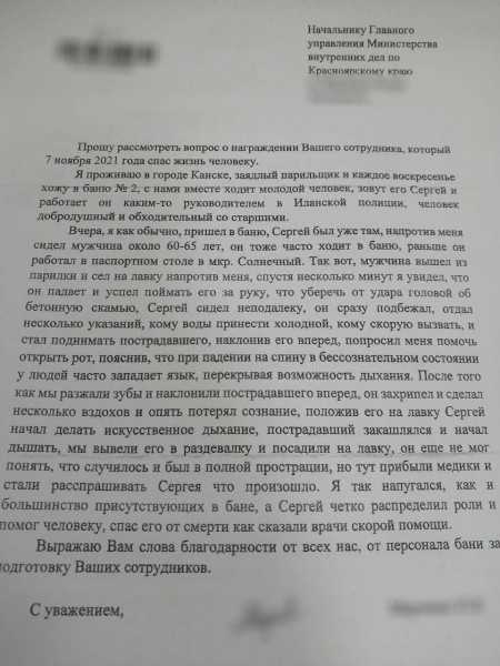 На имя начальника Главного управления МВД России по Красноярскому краю поступила благодарность от имени очевидца.