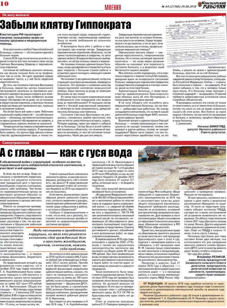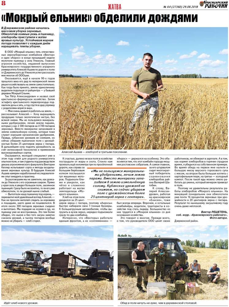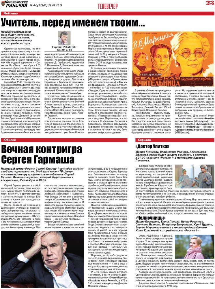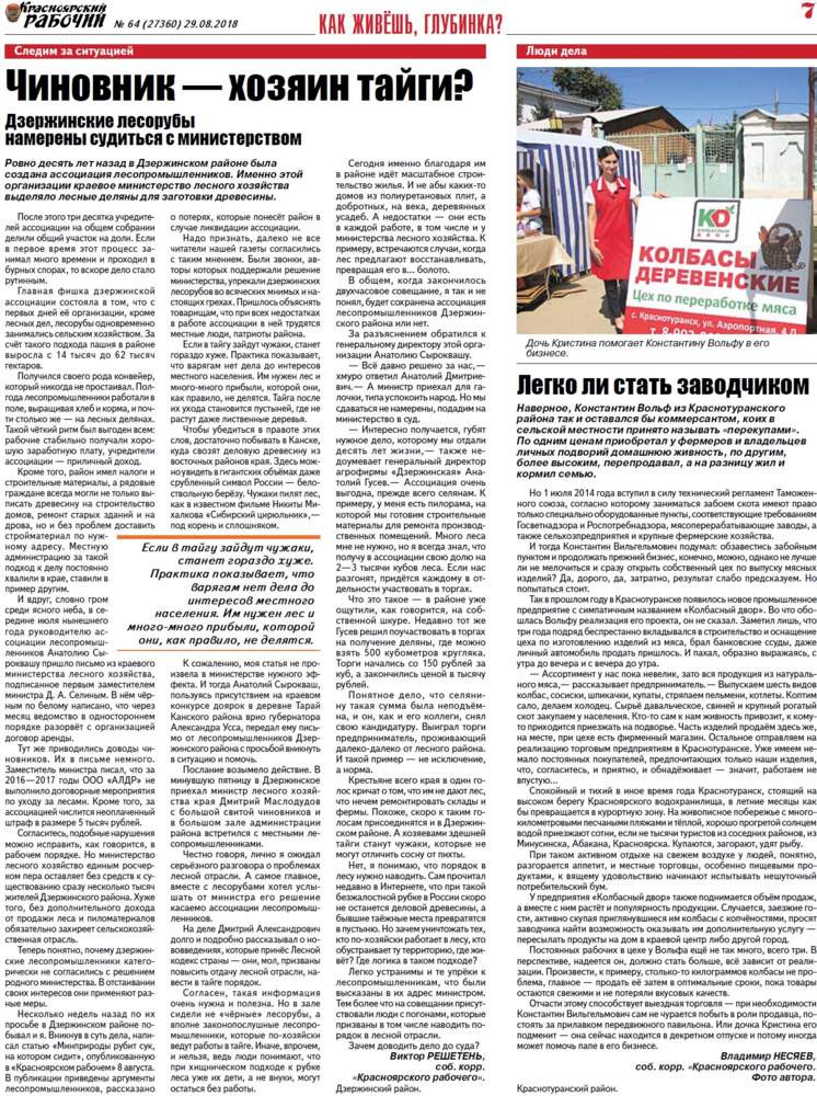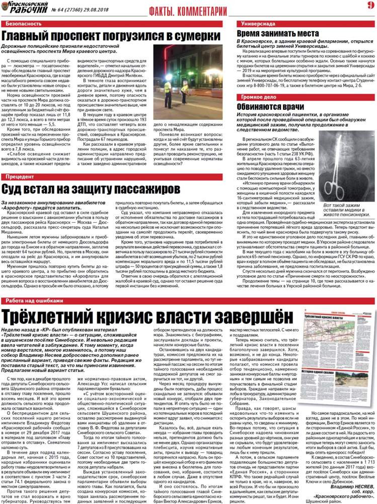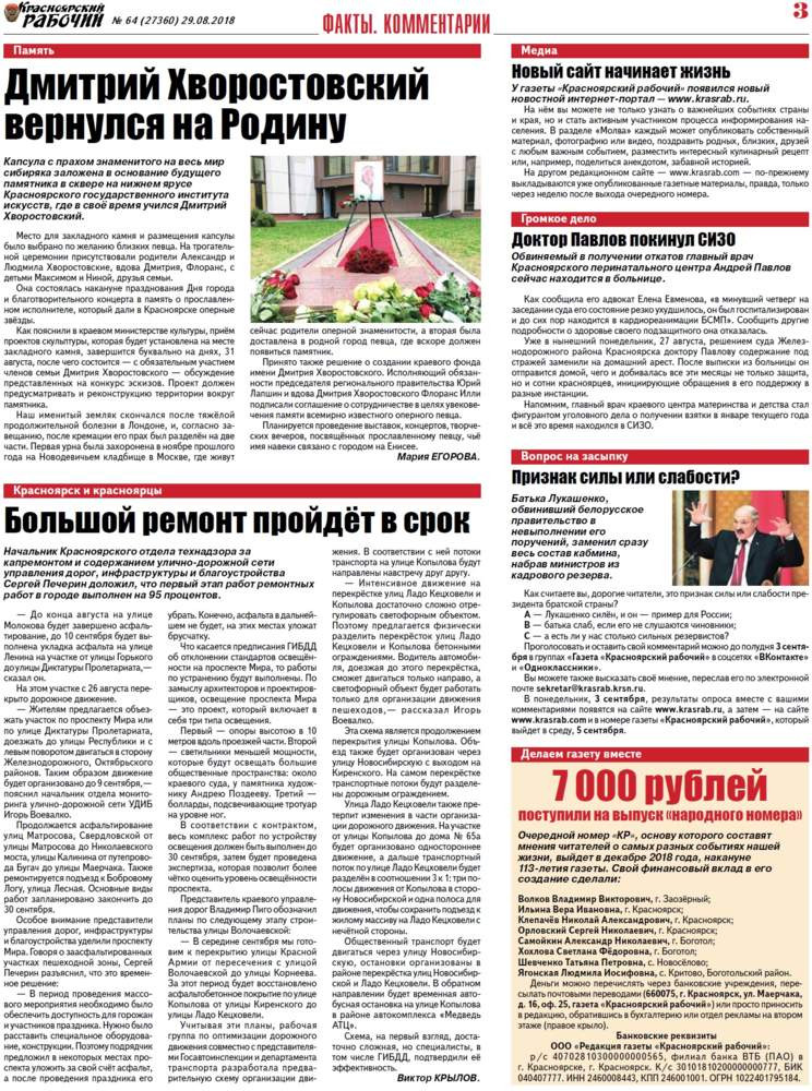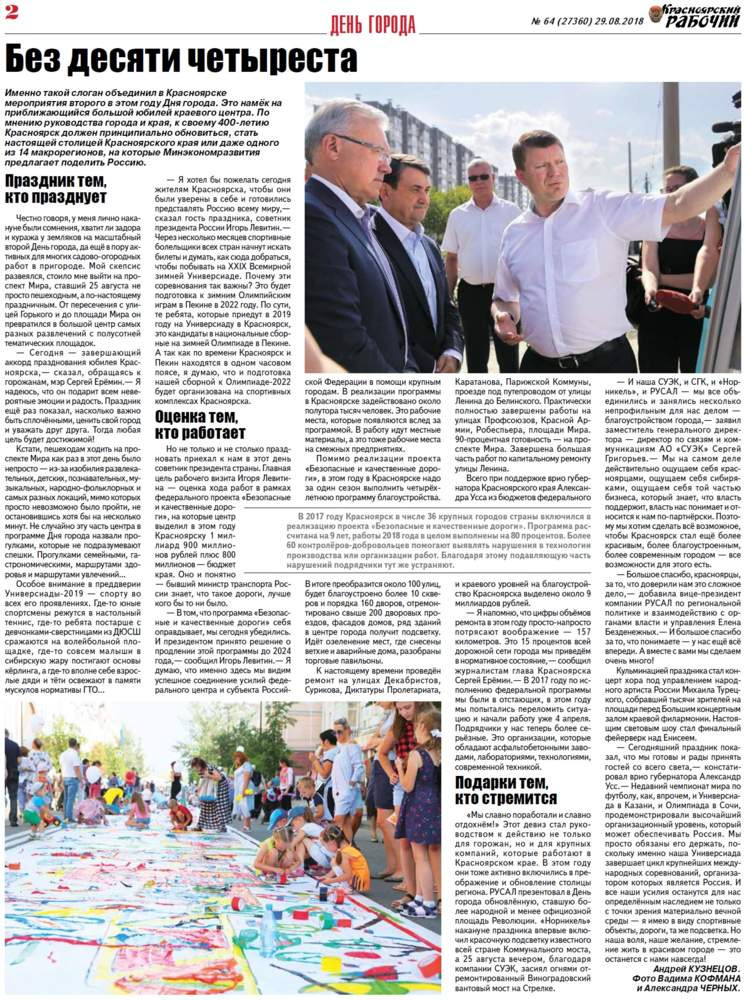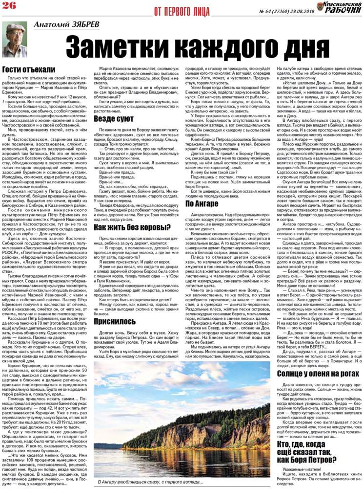 О чём пишет «Красноярский рабочий» в среду, 29 августа 2018 года