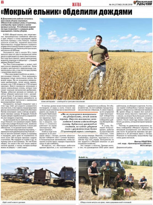 В Дзержинском районе началась массовая уборка зерновых. Обмолотив озимые рожь и пшеницу, хлеборобы приступили к жатве яровых культур. Устойчивая жаркая погода позволяет с каждым днём наращивать темпы уборки. Корреспондент «КР» побывал в ООО «Мокрый ельник», где летом урожай пострадал от засухи.