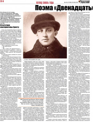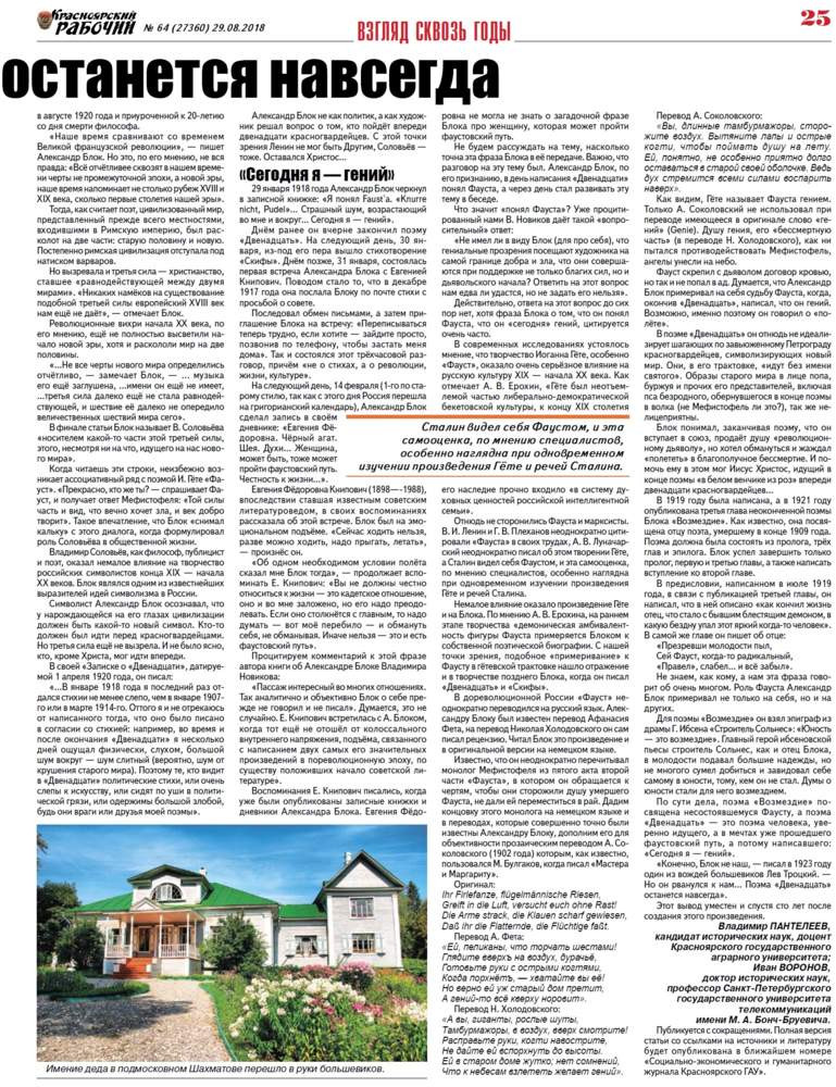 Чуть более ста лет назад в левоэсеровской газете «Знамя труда» была впервые опубликована поэма Александра Блока «Двенадцать». Это произведение не без оснований называют «первой страницей советской литературы», и споры вокруг него не утихают до сих пор. Своими размышлениями на страницах «КР» делятся два учёных -- красноярец Владимир Пантелеев и питерский профессор иван Воронов.