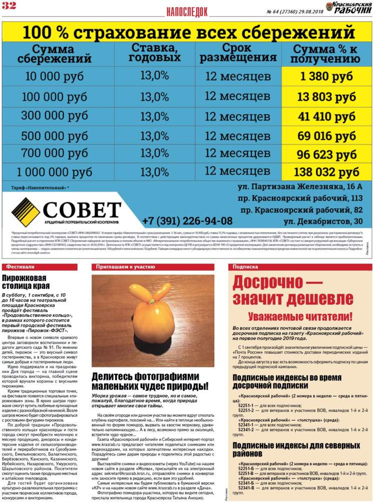 Общероссийский индекс «Красноярского рабочего» - 12647 (недельный комплект, среда и пятница), краевые - 52251 (недельный комплект, среда и пятница), 52341 (среда, "толстушка").