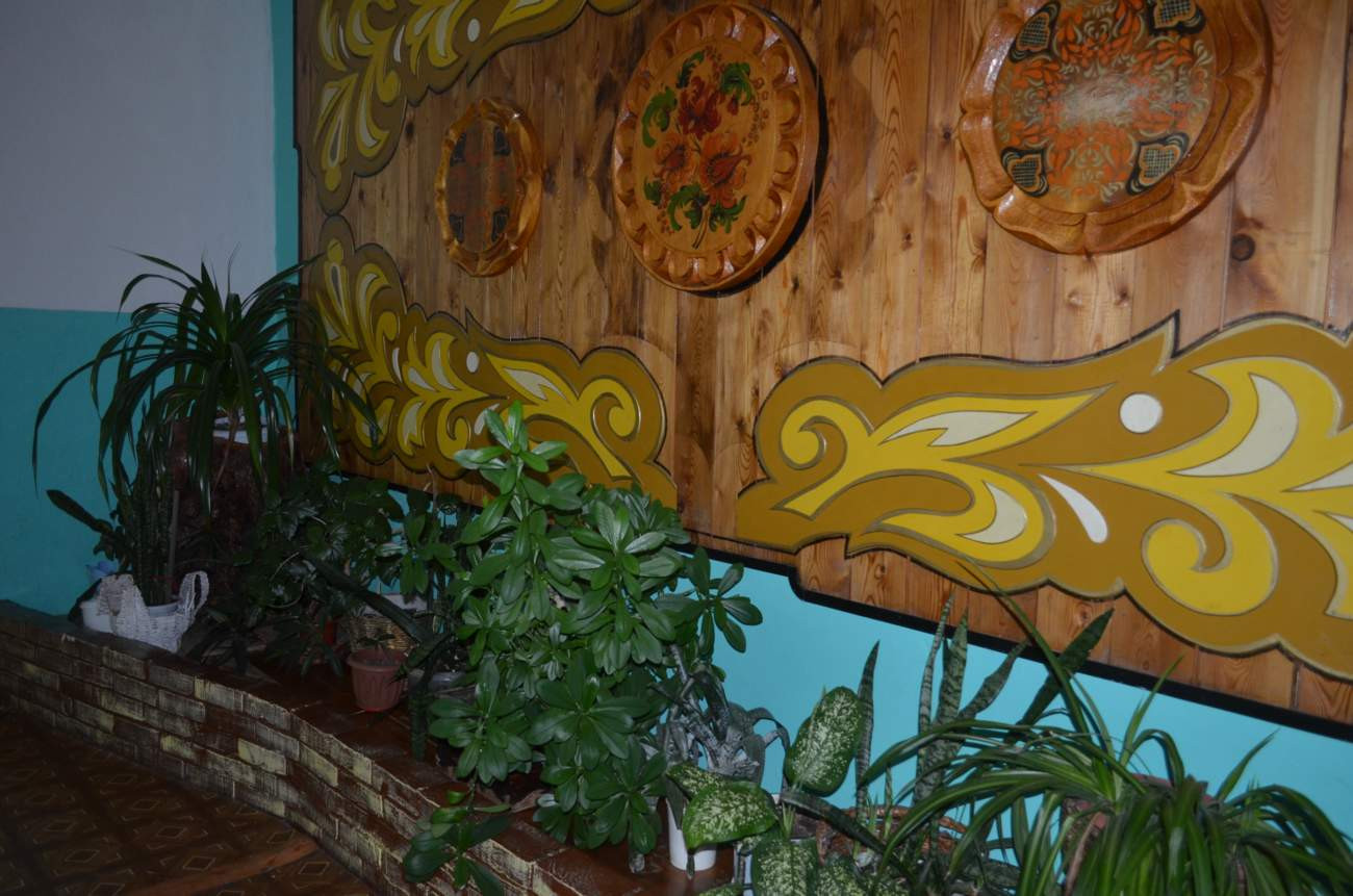 Всюду на стенах - резьба по дереву, роспись "под хохлому" и множество других доселе не виданных "чудес". Огромное резное панно с элементами сибирской природы поразило своим великолепием. Я нигде не увидел повторяющихся рисунков или узоров.