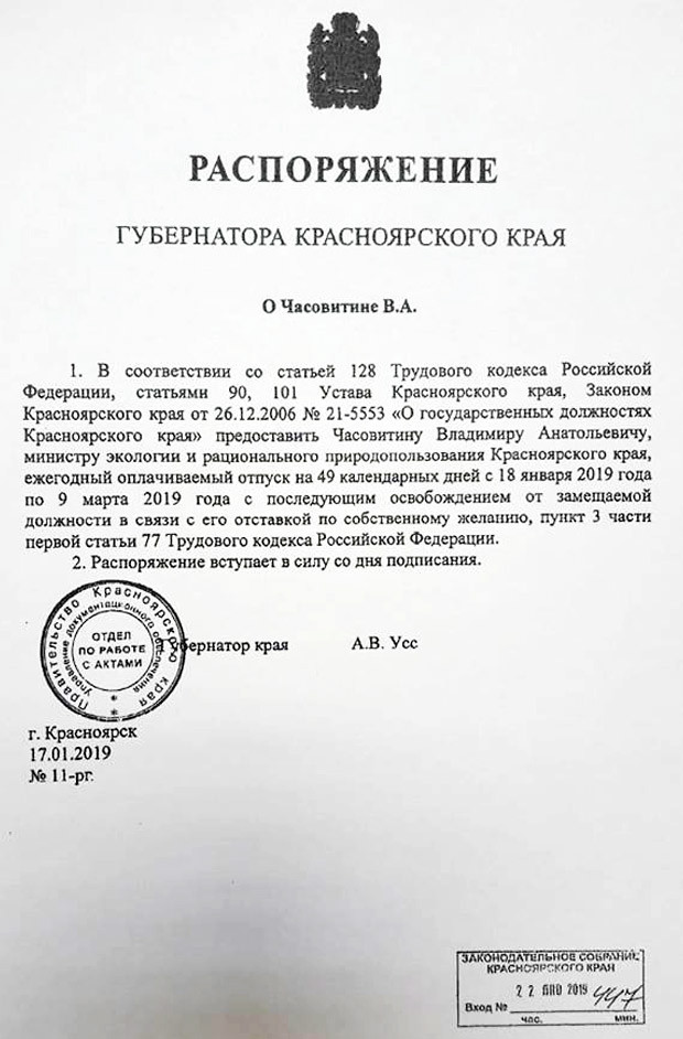 Министра экологии и природопользования края Владимира Часовитина красноярские СМИ отправили в отставку.