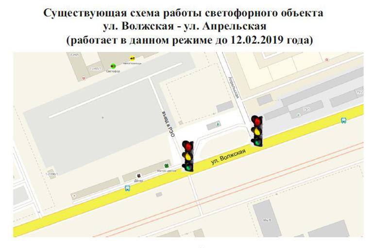 В настоящий момент автомобили на улицу Волжскую выезжают одновременно с улицы Апрельской и со стороны РЭО ГИБДД и встраиваются в короткий участок между двумя светофорами, которые сейчас работают в одинаковом режиме.