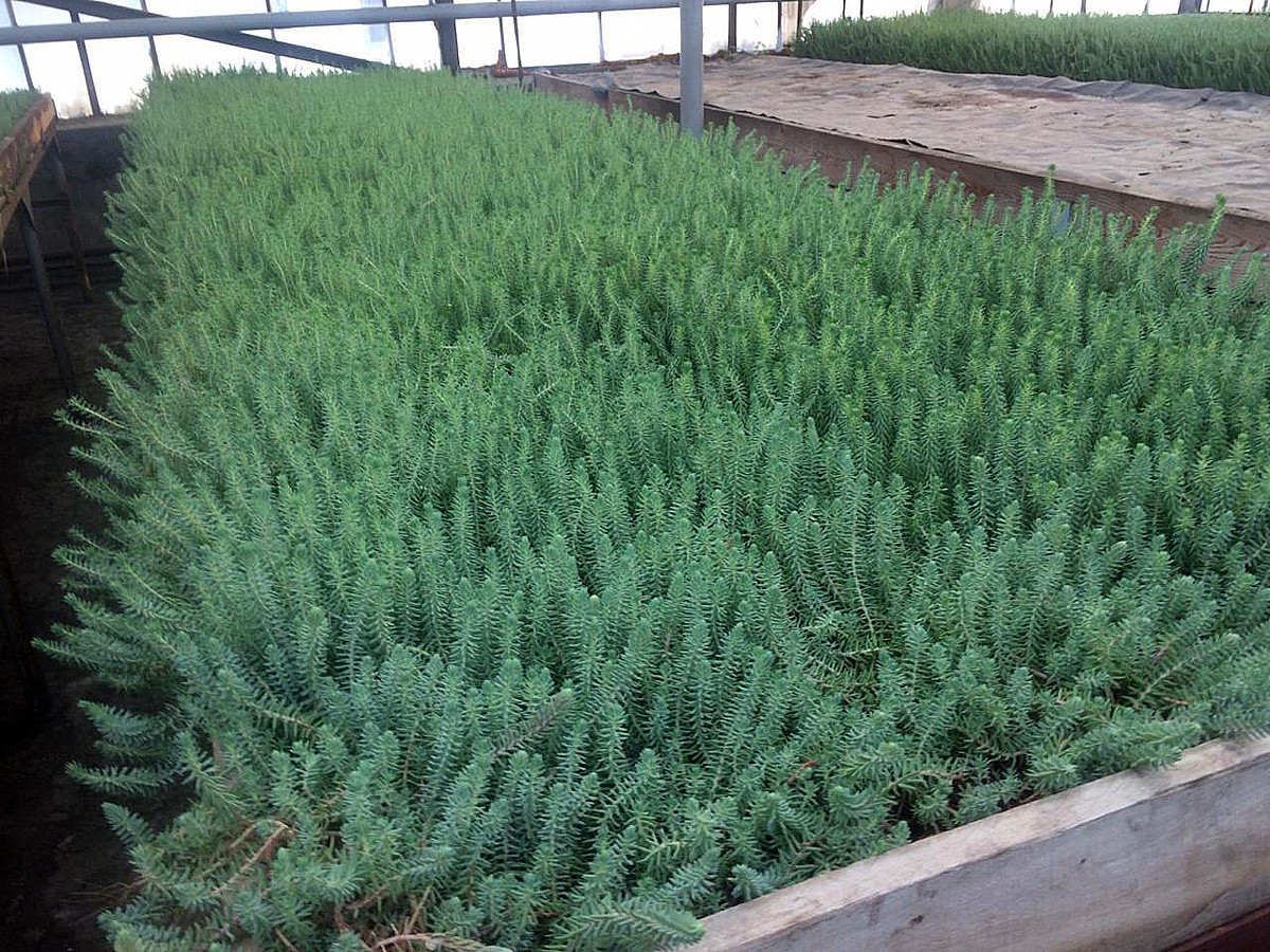 Важный этап работы сейчас и в теплицах, где выращивают седум - главное растение, которым оформляют фигуры вертикального озеленения. Для "слонов", "жирафов", "оленей" и прочих 64 фигур нужно вырастить миллионы росточков. Чтобы они оставались "пушистыми" и мелкими, именно в февральские морозные дни важно обрезать с рассады все мелкие цветочки.