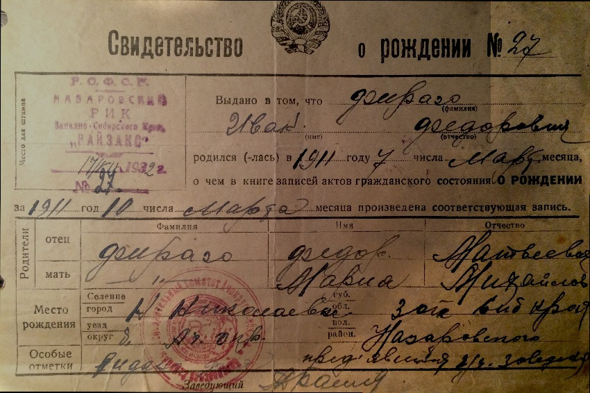 Переехали они в Ачинский уезд, Берёзовскую волость, деревню Ново-Николаевку. В Сибири родились сыновья Максим Фёдорович (1900 год), Федот Фёдорович (1907), Иван Фёдорович (1911 год).