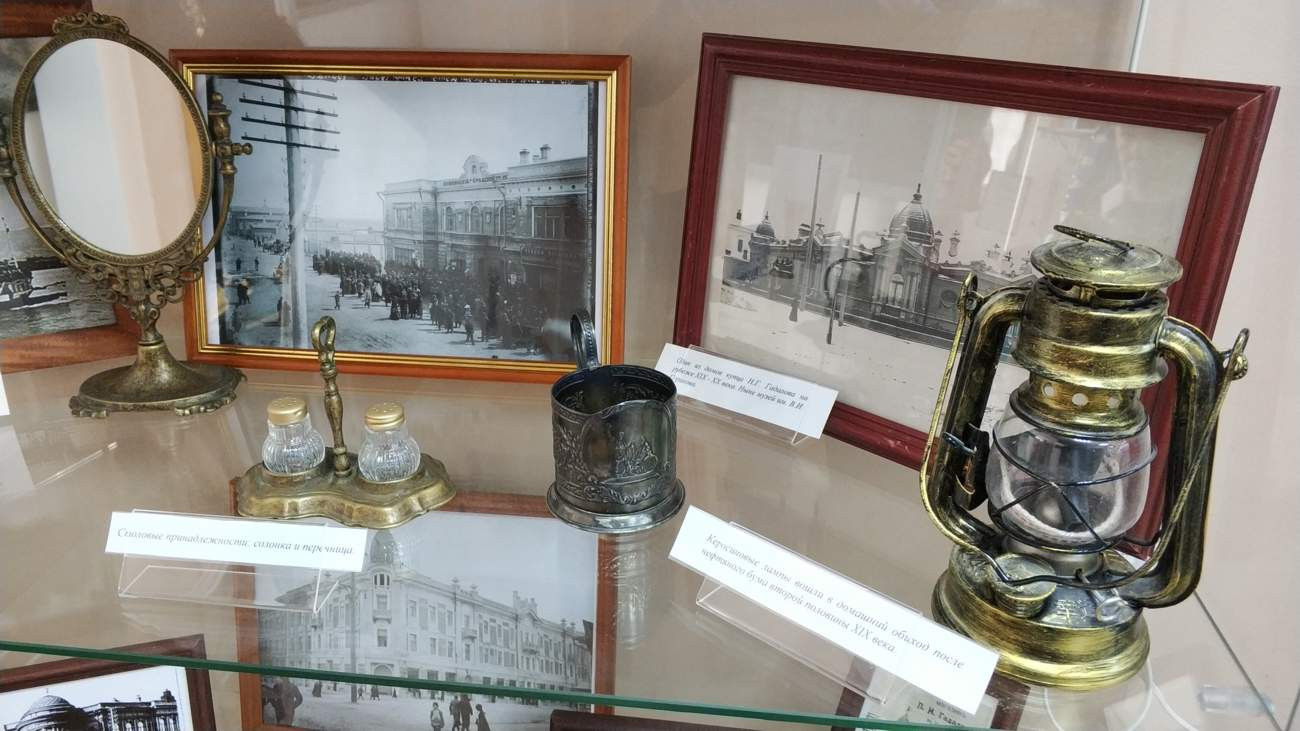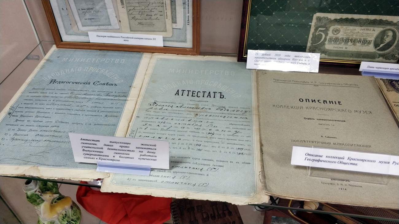 Особый интерес представляют предметы обихода и документы с вековой историей. В экспозиции есть обложка паспорта подданного Российской империи, а также аттестат выпускницы женской гимназии Пелагеи Алексеевны Белогуровой. Документ давал девушке право заниматься учительской деятельностью на дому. Выпускницы гимназии работали гувернантками в купеческих семьях.