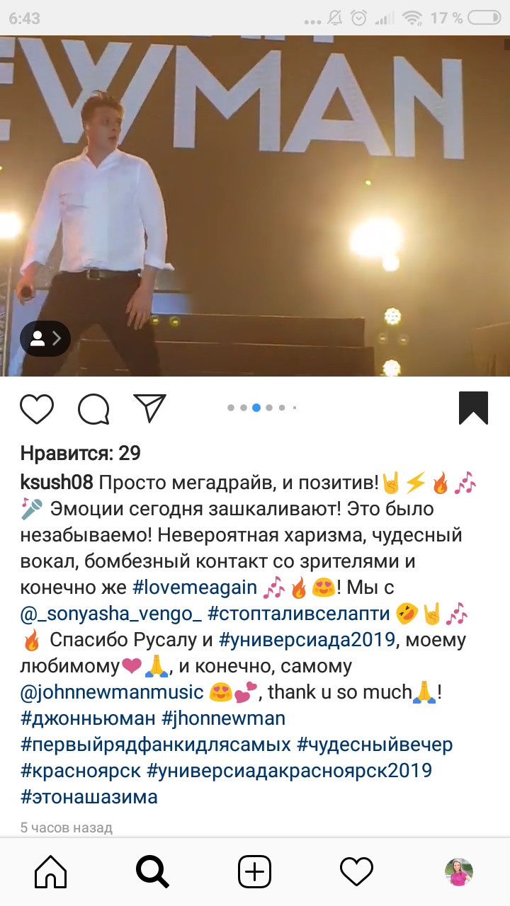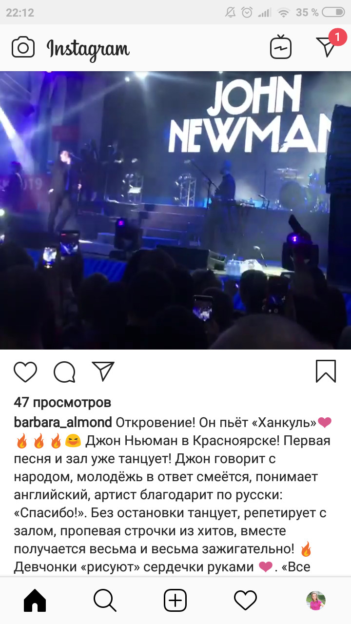 Для музыканта выступление в Красноярске в рамках XXIX Всемирной зимней универсиады стало возвращением на сцену после перерыва. Джон Ньюман исполнил свой новый сингл «Feelings», официальный релиз которого состоялся несколькими днями ранее. «Back in business!!!!!» - написал он на своей странице в Инстаграм после концерта. Красноярцы и гости Универсиады тепло встретили артиста в Сибири. В социальных сетях – множество восторженных отзывов, а под записью Ньюмана в Инстаграм после концерта – 170 благодарных комментариев.