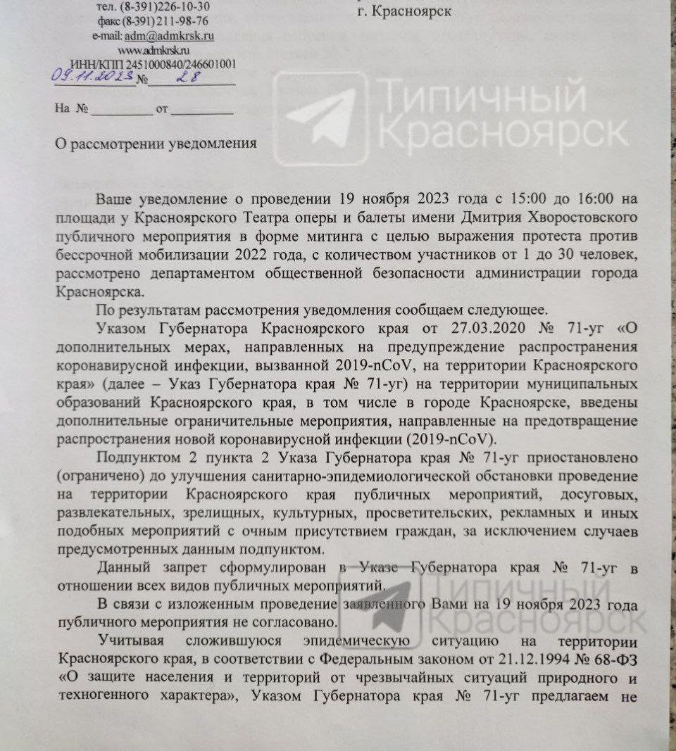 Недовольные такой ситуацией красноярцы хотели 19 ноября собраться на митинг возле Театра оперы и балета. Соответствующее уведомление было направлено в мэрию. Однако замглавы города - руководитель департамента общественной безопасности Михаил Будников запретил мероприятие. Документ был опубликован телеграм-каналом "Типичный Красноярск".